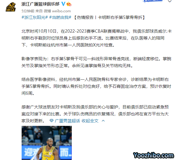 360直播10月12日,CBA浙江广厦宣布外援卡明斯的伤病最新情况,卡明斯对战辽篮的比赛上演自己的CBA首秀,期间右手戳到对位球员身上后感到右手不适。去到医院进行检查,结果是右手第5掌骨干可见一斜线形异常骨透亮线,断端轻度移位。诊断结果为卡明斯右手第5掌骨骨折,已经进行了固定,预计恢复时间6周。