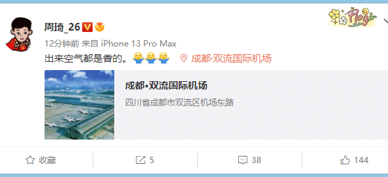 周琦在成都双流国际机场,他登机前感慨:出来空气都是香的