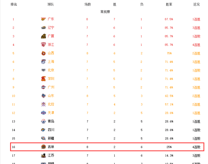 吉林男篮本赛季人员上的变动其实并不大,外援暂时没有归队,本土球员中除了张彪离队,阵容没有什么变化。上个赛季吉林给人的感觉是在姜宇星和姜伟泽的带领下表现强势,反倒是琼斯归队之后球队表现不稳定,由此吉林男篮的本土球员受到了不少人的称赞。但没想到的是新赛季开始8轮,第一阶段的赛程已经过半,他们就已经输了6场比赛,令人有些遗憾。