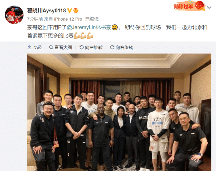 翟晓川在社交网络上写道:“豪哥这回不用P了@JeremyLin林书豪, 期待你回到球场,我们一起为北京和首钢赢下更多的比赛。”