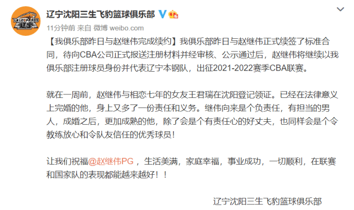 辽宁队方面,赵继伟正式续约留队,辽宁队官宣这一好消息,赵继伟也是双喜临门,他在23日刚刚领证结婚,迈入人生新阶段。赵继伟和辽宁队完成续约,新赛季他将继续联手郭艾伦、韩德君冲击冠军。辽宁队官方表示赵继伟是按照标准合同续约,不过以他的水平,应该配得上顶薪合同。
