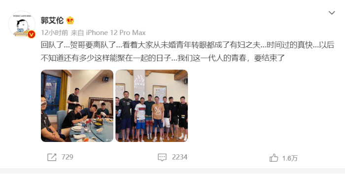 郭艾伦发文“回队了…贺哥要离队了…看着大家从未婚青年转眼都成了有妇之夫…时间过的真快…以后不知道还有多少这样能聚在一起的日子…我们这一代人的青春,要结束了 ”的确,不知不觉中郭艾伦也已经28周岁了,一代人的青春要结束了,贺天举离队可能只是开始。