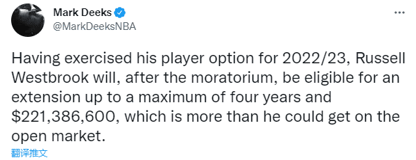 360直播06月30日讯 ,据NBA分析师Mark Deeks报道,在执行下赛季球员选项后,威少将有资格与湖人签下4年2.21亿美元的顶薪提前续约合同,这比他在自由市场上能获得的合同更大;威少该合同最后一年的年薪将达到6127万美元,但是考虑到届时工资帽也将上涨,这份年薪的大小暂时无法衡量。