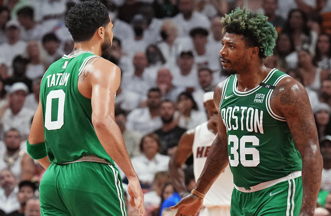 360直播05月20日讯 今天NBA季后赛东部决赛G2结束了争夺,最终凯尔特人客场取得了一场25分的大胜,系列赛大比分来到1-1平。斯玛特和霍福德归来之后效果立竿见影,尤其是砍下24分9篮板12助攻3抢断的斯玛特,不愧是本赛季常规赛最佳防守球员,他在攻防两端都贡献了超神的表现。双探花组合布朗和塔图姆合砍51分,两人手感都不错。热火的塔克遗憾伤退,巴特勒空砍29分6篮板3助攻的数据。