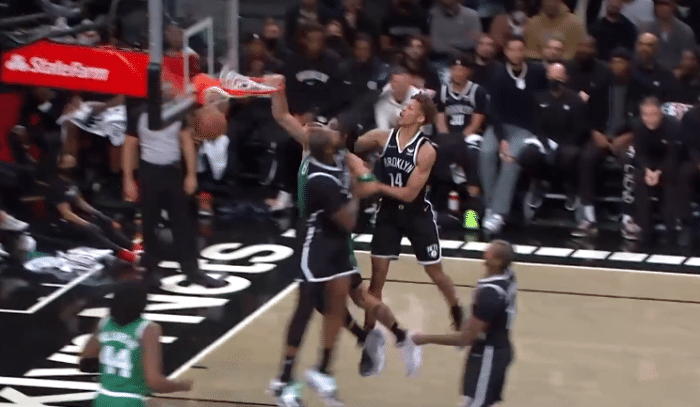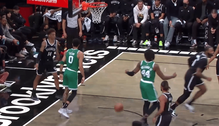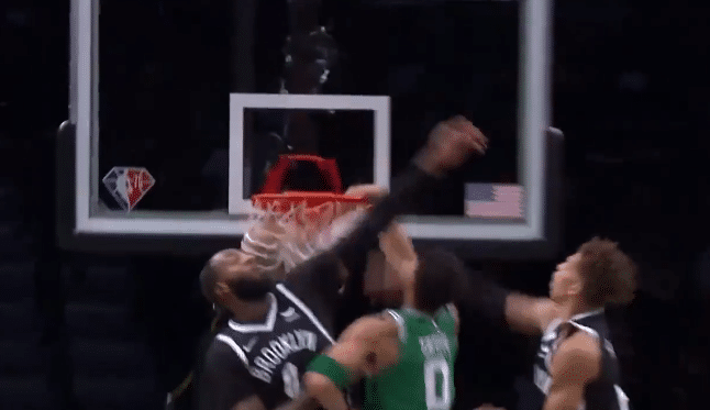 这是第二节还剩下2分多钟,斯玛特传球,塔图姆空切直杀篮下,他迎着德拉蒙德的防守,上演滑翔单臂战斧,直接隔扣了庄神,落地之后还怒瞪篮网小将凯斯勒-爱德华兹,相当霸气。值得一提的是在塔图姆暴扣的时候,身后还有凯斯勒-爱德华兹等人的起跳防守,所以塔图姆等于是在多人的包夹中起飞暴扣,还隔扣了篮网中锋庄神。