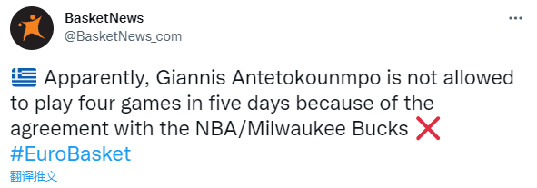 360直播09月06日讯 欧洲杯小组赛希腊93-77大胜英国,雄鹿巨星字母哥轮休缺席比赛,因膝盖不适而休战吗?据美媒BasketNews报道,字母哥昨晚轮休的原因是希腊与雄鹿达成了协议,不允许他在五天内打四场及更多比赛;富尼耶呼吁给球员更多的休息时间,东契奇直言可能导致更多的伤病。