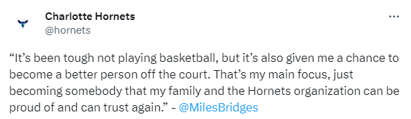 22-23赛季迈尔斯-布里奇斯因家庭暴力事件被禁赛30场,已被禁赛20场,另外10场比赛将在下赛季执行。21-22赛季,布里奇斯场均得到20.2分7.0篮板3.8助攻,因家暴事件错失4年1亿美元的续约合同。