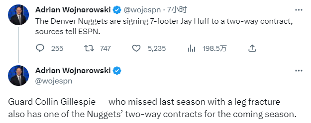 360直播讯07月17日掘金完成两笔操作,双向合同签约湖人旧将胡夫以及官宣2年1025万续约雷吉-杰克逊,因此卫冕冠军新赛季15+3阵容出炉,约基奇和穆雷领衔继续冲冠。
