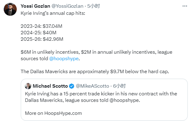 据名记Michael Scotto报道,欧文的合同包括15%的交易保证金。