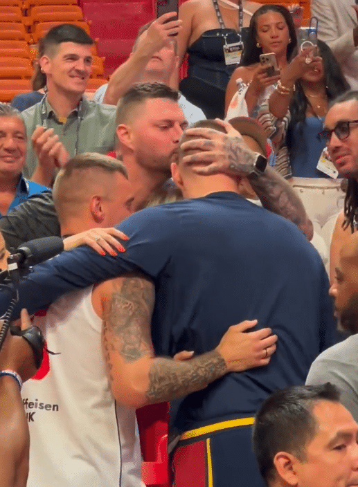 G4赛后掘金球迷霸占热火主场,约基奇走上看台并且拥抱亲吻自己的家人——现场亲吻老婆后搂着两个哥哥庆祝,大哥亲吻约老师的额头,此时此刻,他们一家人太幸福了。
