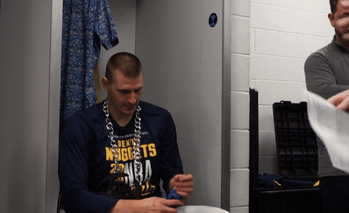 回到更衣室,掘金主场马龙点名盛赞戈登、约基奇等球员, 现场众人跟着起哄,最终马龙把象征本场最佳的大金链子颁给了约基奇,两人紧紧拥抱在一起。