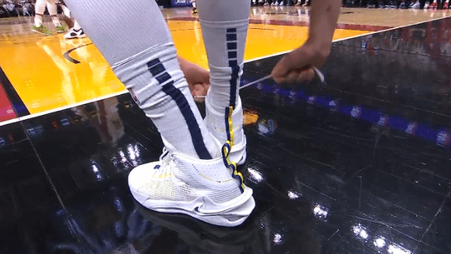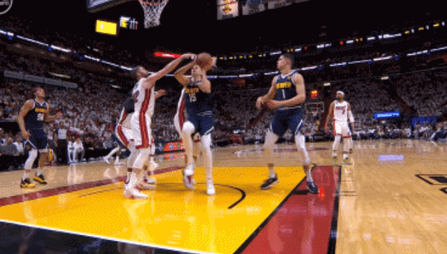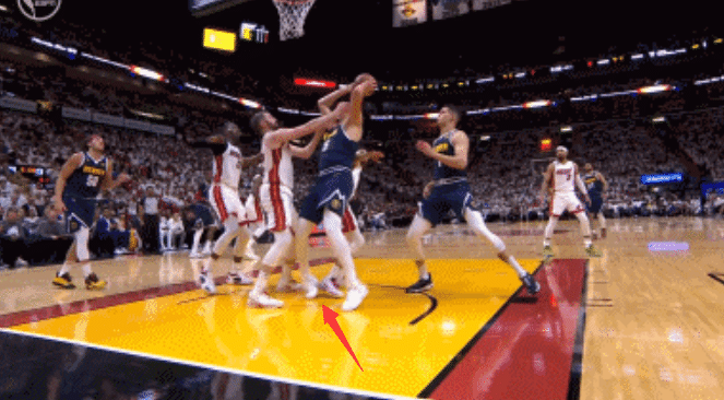 这是第一节进行到中段,约基奇抛投不中,他抢篮板的时候崴脚,即便是这样的情况下约基奇依旧抢到篮板,把球给到队友。慢镜头可以明显看到,约基奇扭到右脚踝,随后他紧了紧鞋带后继续比赛,轻伤不下火线。