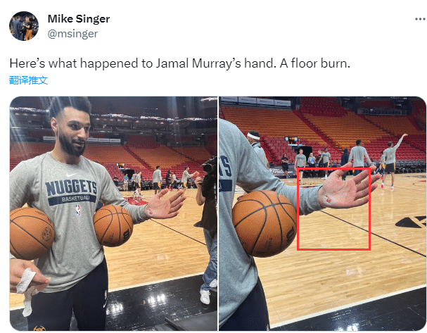 在总决赛G3下半场,穆雷在一次倒地时不幸擦伤手掌,当时队医为他消毒治疗时,穆雷痛得弯腰向后撤;穆雷的左手掌大片擦伤,明显破皮了一大块,这伤口看着都痛;不过穆雷带伤坚持,绑上绷带继续比赛。