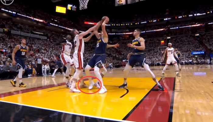 约基奇禁区强硬出手不中,高高跳起保护进攻篮板,落地时右脚踩到斯特鲁斯的脚后跟,导致右脚踝扭了一下,之后约基奇重新绑紧鞋带,忍痛继续坚持比赛,所幸约基奇的脚踝无大碍。