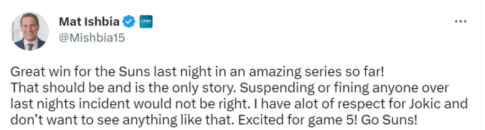 伊什比亚写道:“太阳队昨晚的胜利很棒,系列赛的精彩程度目前为止是让人惊叹的,这本来也应该是它唯一的故事!若因昨晚的事情对任何人进行禁赛或者罚款都是不对的,我非常尊重约基奇,不想看到这样的事情发生。我对第5场比赛感到兴奋,加油太阳队!”
