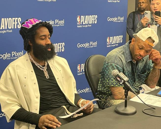 赛后,哈登接受采访时戴着两条大金链子并且头顶小帽亮相。