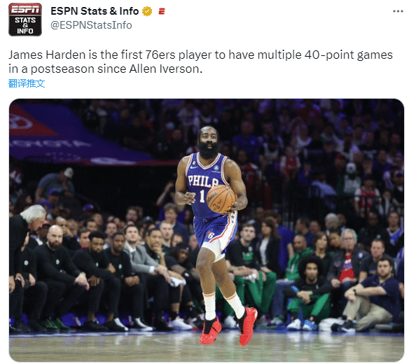 4、哈登本次季后赛多次40+成03年艾弗森后队史首人