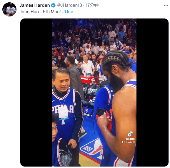 值得一提的是,76人拿下G4赛后,哈登将本场比赛的战靴送给枪击案中幸存的中国小球迷,拥抱以及送签名战靴,发推晒送鞋视频并写道:约翰-郝,最佳第六人。