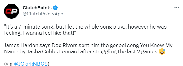 哈登爆发真因曝光?赛后76人主帅里弗斯表示,赛前他让哈登听一首名为“你知道我的名字吗”的歌曲,以此让哈登找到感觉。