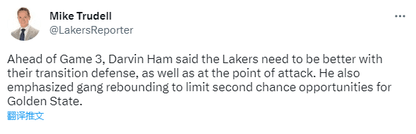 湖人G3该如何调整?湖人主帅哈姆透露比赛计划,他表示湖人需要在转换防守和进攻端做得更好,还强调全队都要保护篮板从而限制勇士二次进攻的机会。