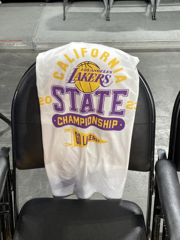 湖人主场已经铺满了T恤,T恤中印有“2023年加州冠军赛”、“湖人冲啊”的字样。