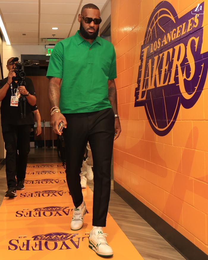 赛前,詹姆斯身穿黑色长裤和绿色短袖,戴着墨镜帅气入场,表情严肃颇具大佬范;湖人G2惨败27分,詹姆斯全场18投10中拿到23分7篮板3助攻,G3关键一战,全力詹或强势来袭。
