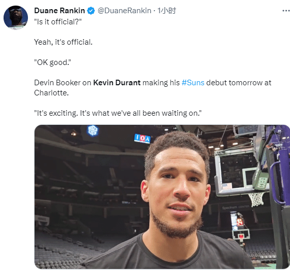 360直播讯03月01日,菲尼克斯太阳队官方正式宣布,杜兰特将在明天对阵黄蜂的比赛中迎来太阳生涯首秀,还发布杜兰特首秀预告片,杜兰特因伤连续缺席20场比赛后,他终于迎来复出以及太阳首秀;杜兰特自曝膝盖早已不再痛疼,布克超级兴奋。
