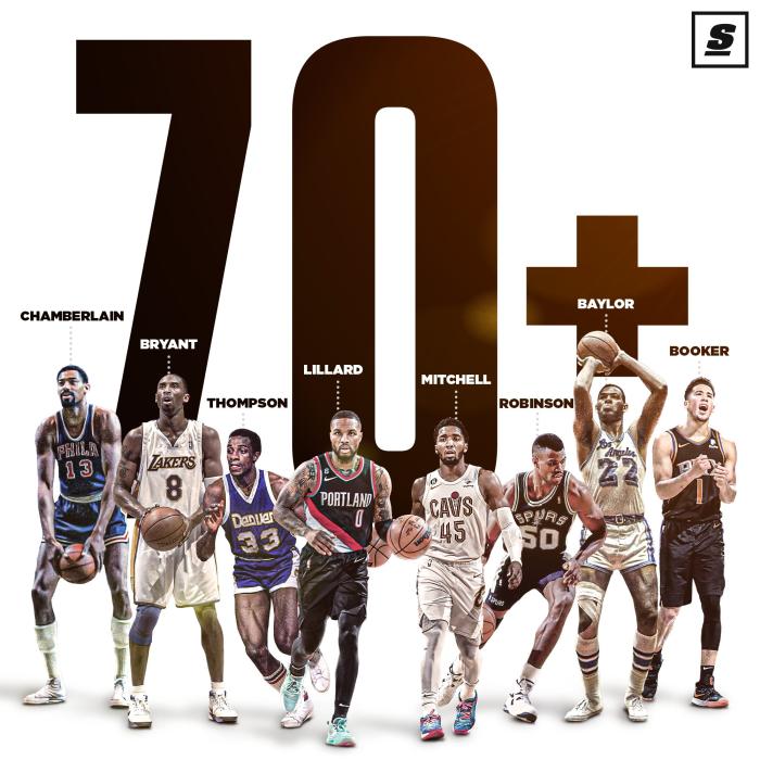 第二、利拉德成为历史第一位在仅投中少于10记两分时,拿到70+的球员;仅命中9个两分球就轰下70+,得分70+两分命中数第二少的球员是米切尔。