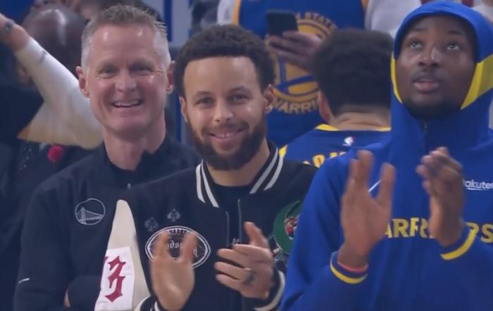 360直播12月31日讯 ,在开拓者对阵勇士赛前,勇士旧将小佩顿正式领取总冠军戒指,追梦给佩顿颁发了上赛季的总冠军戒指,全场球迷为他欢呼,库里、科尔大笑为他鼓掌。