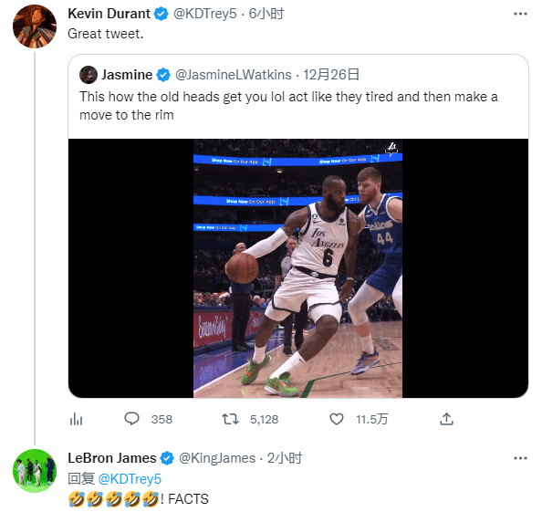 360直播12月28日讯 ,在湖人和独行侠年终大战中,詹姆斯假装累了来麻痹防守者一幕引热议,杜兰特直言不错的推特,詹姆斯则回复KD:事实。