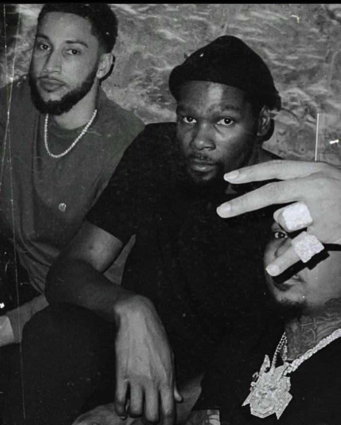 杜兰特身穿黑色T恤、戴着心爱的针织帽现身夜店,西蒙斯则是身穿长袖卫衣,戴着大金链子;从曝光的视频可以看出,杜兰特和西蒙斯与说唱歌手同时对着镜头时,西蒙斯心情不错,另外他们三人附近有一位长发女郎正在跳舞摇摆。