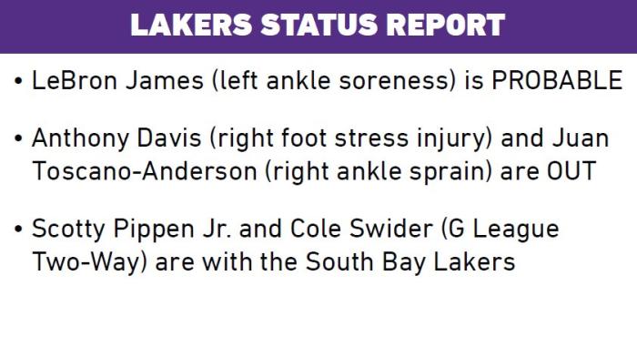 360直播12月25日讯 ,湖人官方公布年终大战对阵独行侠的伤情报告,詹姆斯(左脚踝酸痛)大概率带伤出战,浓眉(右脚应力性损伤)、托斯卡诺-安德森(右脚踝扭伤)缺席比赛,小皮蓬和斯威德都仍旧在发展联盟,继续为南湾湖人效力。