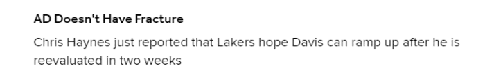 360直播12月24日讯 ,湖人官方正式宣布浓眉因右脚应力性损伤而无限期休战,浓眉伤势令人担忧,之后BR记者克里斯-海耶斯报道,浓眉的右脚没有骨折,他现在的感觉很好,浓眉将会在2周后接受复查,若恢复顺利,到时他可以为复出而加强训练强度。