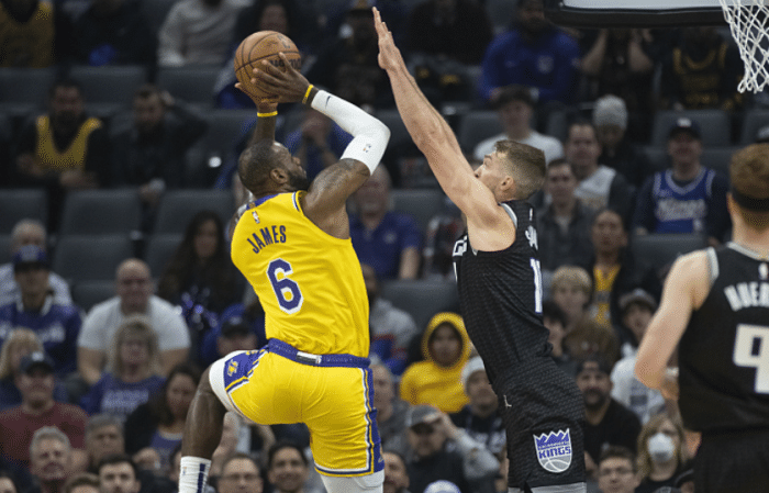 首节比赛,湖人5-0开场,期间詹姆斯持球杀到禁区上篮得分,之后国王反扑,詹姆斯连续中投得分,两队第一节打得十分胶着,老詹首节贡献6分。