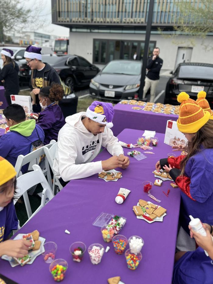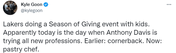 湖人记者Kyle Goon表示,湖人队与孩子们一起举办捐赠活动。显然今天是安东尼=戴维斯尝试所有新职业的日子;之前在橄榄球上担任角卫。现在变身为糕点师。