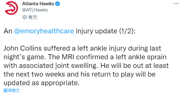 科林斯是在上一场对阵魔术的比赛中受伤的,上半场最后时刻,特雷-杨为科林斯送出空接,这一球已经超时,科林斯还在落地时不幸崴脚受伤,仅打16分钟就因伤退出比赛,如今他的伤势确诊为左脚踝扭伤,因伤至少休战2周。