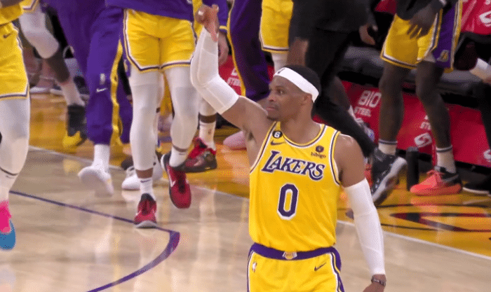下半场,第三节詹姆斯先是组织进攻,不看人助攻里夫斯;打着打着老詹禁区二次补篮,外线迎着尤班克斯轰进三分,带领湖人打出15-2的超级攻势,此时湖人领先到15分;4分55秒老詹下场休息,之后浓眉等主力也下场,威少带着全替补阵容打,威少轰进超远压哨三分 ,三节打完湖人97-82领先15分。