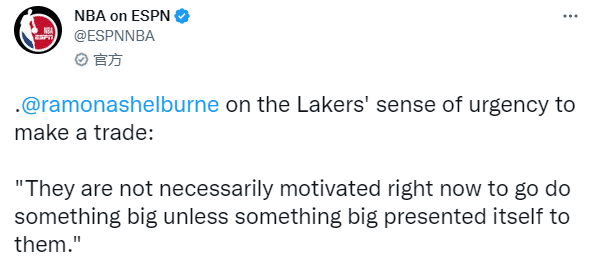 名记Ramona Shelburne在节目中表示:我认为湖人最近取得了一些胜利,目前西部战绩有很混乱,他们不会着急去做交易,而且就目前来说,当他们保持健康的时候,他们的表现也非常不错,你可以在最近的比赛中看到他们的进步,虽然他们的对手都不是什么强队,但你仍可看到他们的进步;特别是看到詹姆斯站出来去保护威少(指威少额头受伤后),联盟周边人士普遍认为,湖人现在不会采取什么大动作,除非有大事发生。