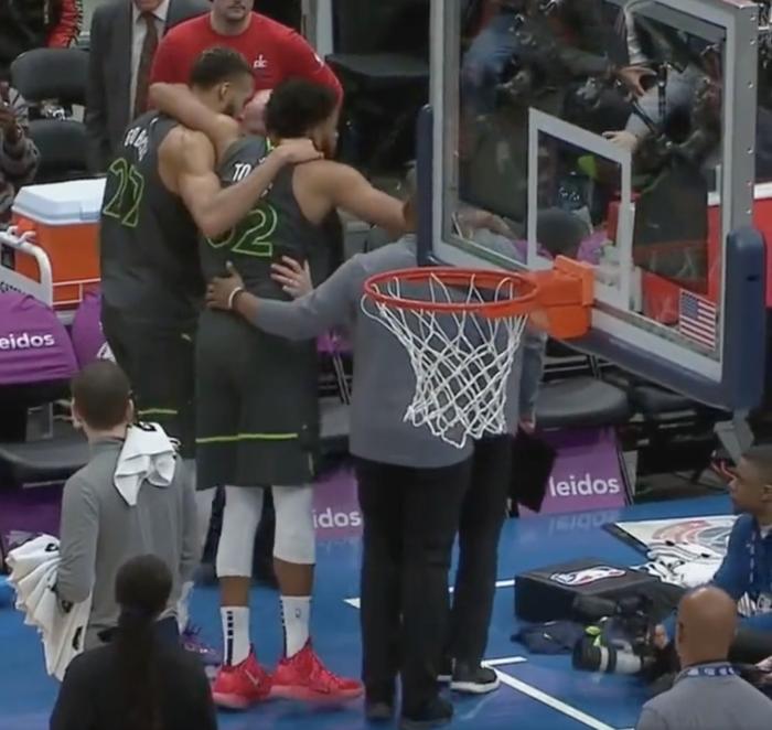 360直播11月29日,NBA常规赛森林狼对阵奇才,唐斯无接触受伤痛苦倒地,捂着小腿倒地不起,右腿受伤一瘸一拐,被搀扶返回更衣室接受检查,名记shams报道,唐斯右小腿拉伤,提前退出比赛。