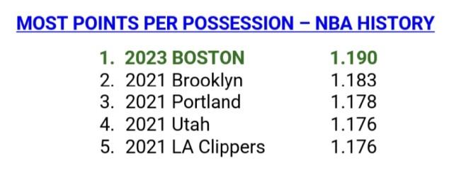 数据显示,凯尔特人目前的进攻每回合得到1.19分,暂列历史第一。如果他们能保持这一数据,就将创造新的纪录。此前的最高值是由2021年的篮网创下的1.183分。