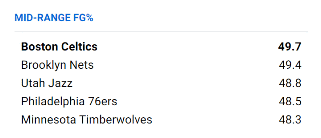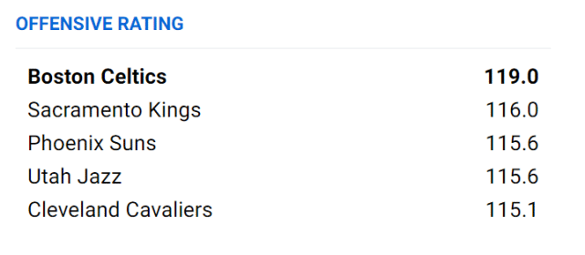 本赛季的绿军,有机会成为史上进攻最高效的球队。他们场均能得到119.8分,排名联盟第一,场均命中16.4个三分球,同样是联盟第一。进攻效率(119.0)、百回合效率差(+7.6)、助攻失误比(2.04)、有效命中率(58.2%)、真实命中率(62%)、中投命中率(49.7%)也都排在联盟第一。
