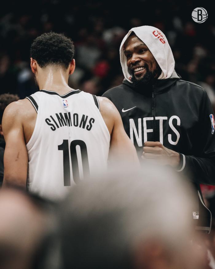 谈到西蒙斯最近在场上的心态有了很大的变化,杜兰特透露:在之前对阵开拓者的比赛中,我溜底线接到了西蒙斯的传球,但我选择把球传给了底角的乔-哈里斯,在他三分不中后,本西跟我说‘你该把那个该死的球扣进去!’。我说,‘好吧,我的错’。
