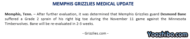 360直播11月16日,孟菲斯灰熊遭重击,灰熊官方宣布,球队后卫贝恩的伤情经诊断确诊为右大脚趾二级扭伤,他将在2-3周后重新接受评估;换言之,灰熊二当家至少伤停2-3周。