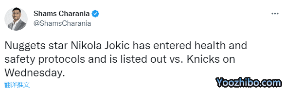 下一场对阵尼克斯,约基奇因触发防疫协议被隔离而无法出战,他的缺战是掘金队的一大损失,另外希望约基奇的进一步检测结果不要呈阳性,否则他将会缺席更多的比赛。