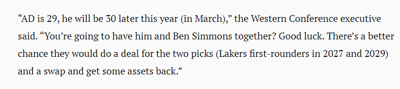 西部某高管谈到浓眉换杜兰特的交易流言,表示:浓眉现在29岁,马上就要30岁了;你会让他和本·西蒙斯联手吗?祝你好运。他们(篮网)很有可能会为这两个选秀权(2027年和2029年的湖人首轮)和湖人达成交易,并交换一些资产。