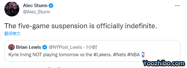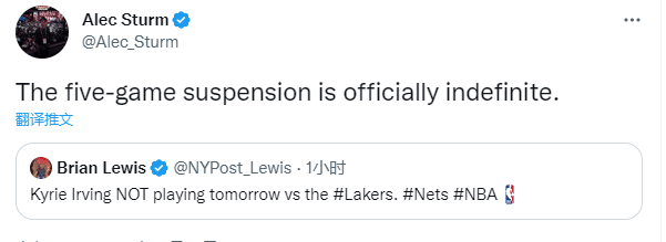 算上今天缺战快船,欧文刚好被禁赛5场比赛,欧文因此损失将近120万美元的薪水,不过欧文已被禁赛5场仍继续缺战,无缘复出大战湖人,篮网记者Alec Sturm表示欧文正式无限期停赛。