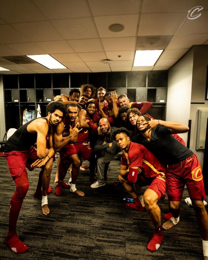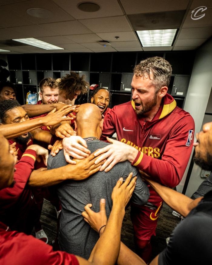 在骑士更衣室内,乐福率领全队偷偷地将象征着全场最佳的大金链颁给了主教练比克斯塔夫,乐福为主帅戴上大金链子,加兰、乐福等全队球员都围着主帅呐喊、欢呼;骑士全队合影留念,加兰露出发狠表情,米切尔和主帅一样抱着双臂,现场氛围太棒了。
