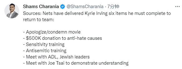 1、道歉和谴责:欧文必须为在10月27日推特转发的电影链接道歉,谴责有害和虚假内容,并明确表示他没有反犹太信仰