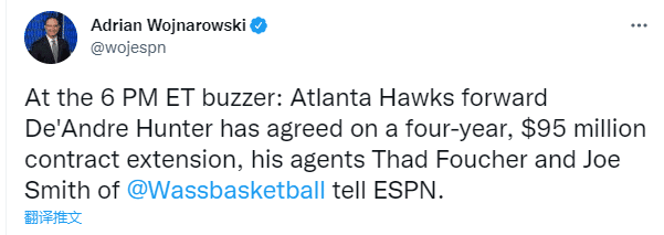 360直播10月18日,据ESPN名记沃纳罗斯基报道,德安德烈-亨特的经纪人透露,亨特已经同意与老鹰达成4年9500万美元的提前续约合同,未来5年继续联手特雷-杨冲击总冠军。