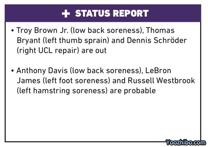 小特洛伊-布朗(下背部酸痛)、托马斯-布莱恩特(左拇指扭伤)和施罗德(右拇指韧带修复手术)都因伤缺席揭幕战;詹姆斯(左脚酸痛)、 安东尼-戴维斯(下背部酸痛)和威少(左腿筋酸痛)都是大概率出战,75%可能性出战。